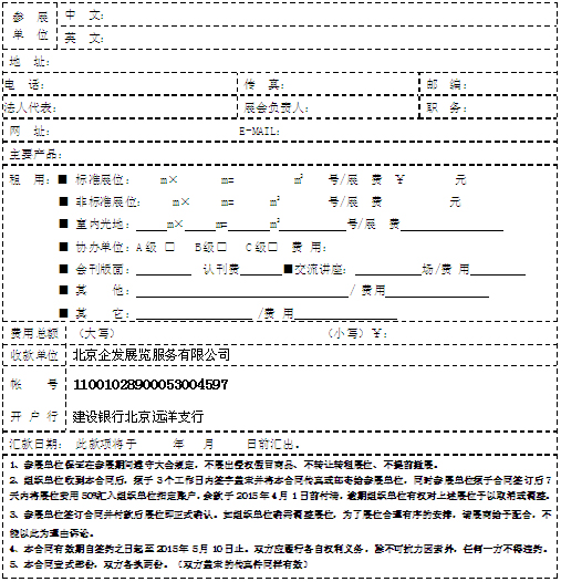 ]電匯或交至組委會,展位順序分配原則:“先申請、先付款、先安排”,余款在2015年4月1日前