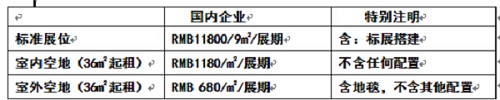 ■標(biāo)準(zhǔn)展位費(fèi)用:包括展出場(chǎng)地、2.5m高壁板、楣牌制作、9平方米地毯、洽談桌一張、二把折椅、10A/220V單相插座一個(gè),射燈二支。