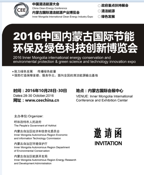 為加快推進(jìn)生態(tài)文明建設(shè),推動綠色轉(zhuǎn)型,發(fā)展綠色產(chǎn)業(yè),搭建國內(nèi)外節(jié)能低碳創(chuàng)新技術(shù)與裝備交流展示及項目合作的國家級平臺,著力打造保障首都、服務(wù)華北、面向全國的清潔能源輸出基地。經(jīng)呼和浩特市人民政府、內(nèi)蒙古自治區(qū)經(jīng)濟(jì)和信息化委員會、內(nèi)蒙古自治區(qū)環(huán)境保護(hù)廳、內(nèi)蒙古自治區(qū)能源開發(fā)局共同研究決定,于2016年10月28日至30日在內(nèi)蒙古國際會展中心聯(lián)合舉辦“節(jié)能領(lǐng)跑、綠色發(fā)展”為主題——2016中國內(nèi)蒙古國際環(huán)保及綠色科技創(chuàng)新博覽會。