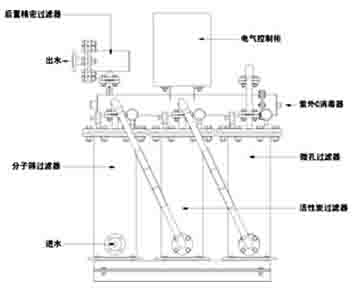 三個過濾罐體內(nèi)分別裝分子篩過濾器、活性炭過濾器、微孔過濾器裝置,為方便系統(tǒng)安裝,所有的進、出水口均設(shè)置在罐體的側(cè)面或頂部,便于系統(tǒng)排氣,水出口端增設(shè)后置精密過濾器。