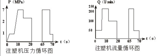 事實上,注塑機液壓系統(tǒng)是一個壓力和流量波動都較大的負載,在合模、鎖模、射膠、保壓、冷卻、開模、頂出等不同工作階段,其壓力和流量都要發(fā)生有規(guī)律的變化,典型的注塑機壓力和流量曲線如下圖所示。