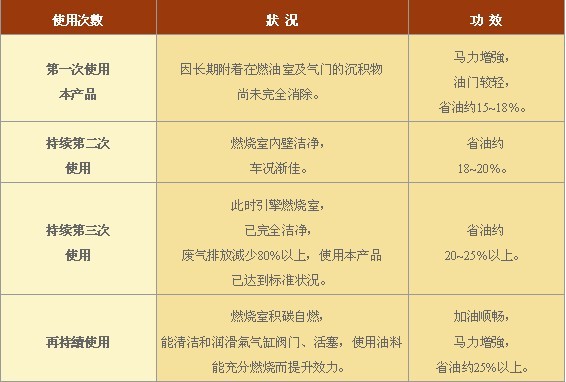 省油效果,依各車況及行車習(xí)慣而有所差異。 (二)、新車因車況佳引擎尚未積碳,使用MAGIC POWER強效增強劑,亦可省油達(dá)10%~15%左右。若長期使用,燃燒室內(nèi)壁潔凈,減少因引擎積碳所造成的摩擦,可保證氣門免于陷縮,免于因使用無鉛汽油,致閥座過度磨損的問題。 (三)、使用柴油車輛,經(jīng)過多種不同車輛測試,使用效果如下: