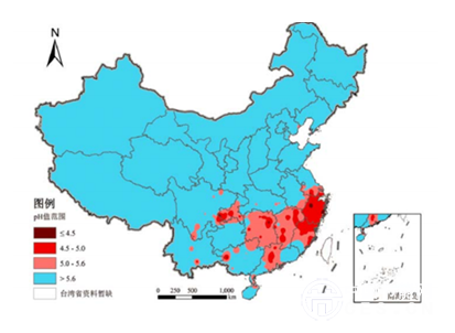 2014 年,470 個監(jiān)測降水的城市(區(qū)、縣)中,酸雨頻率均值為 17.4%。出現(xiàn)酸雨的城市比例為44.3%,酸雨頻率在25%以上的城市比例為26.6%,酸雨頻率在 75%以上的城市比例為9.1%。2014 年,酸雨污染主要分布在長江以南-青藏高原以東地區(qū),主要包括浙江、江西、福建、湖南、重慶的大部分地區(qū),以及長三角、珠三角地區(qū)。2014 年全國降水pH年均值等值線分布示意圖如下: