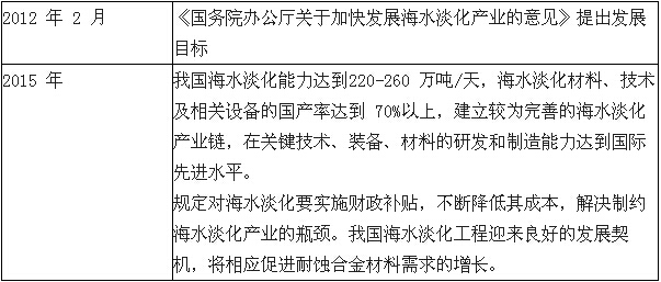 規(guī)定對海水淡化要實施財政補貼,不斷降低其成本,解決制約海水淡化產(chǎn)業(yè)的瓶頸。我國海水淡化工程迎來良好的發(fā)展契機,將相應(yīng)促進(jìn)耐蝕合金材料需求的增長。