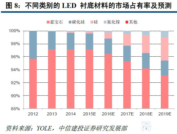 說鼎足之勢,似乎有點(diǎn)言過其實(shí)。從目前的市場應(yīng)用情況而言,藍(lán)寶石襯底在技術(shù)上最成熟,應(yīng)用上占據(jù)了襯底市場90%以上的份額,處于絕對的領(lǐng)先地位;碳化硅襯底雖然體量不大,但以芯片大廠美國科銳(CREE)為代表碳化硅襯底芯片,同樣擁有不可或缺的地位;而以東芝、普瑞、晶能等企業(yè)為代表的硅襯底,從目前的應(yīng)用來看,則要稍遜一籌,體量小,工業(yè)化的規(guī)模生產(chǎn)也還面臨較多問題。圖為中信建投此前所做的襯底市場調(diào)研及對未來的預(yù)測。