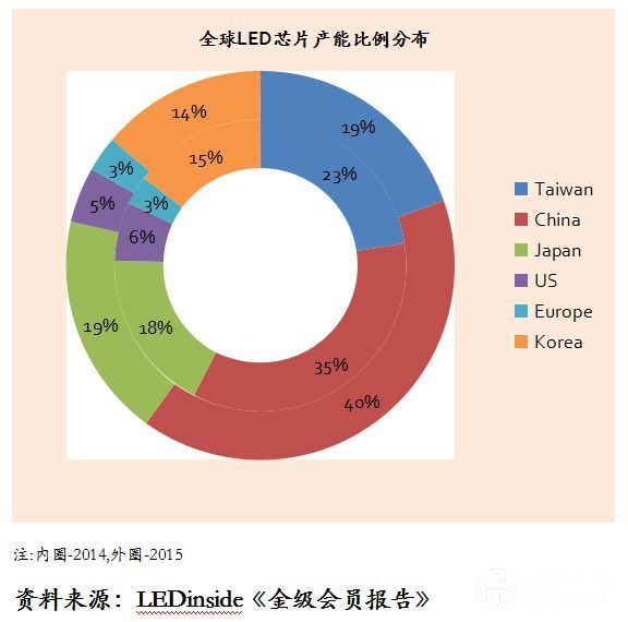 然而時過境遷,LED如今(2015年)已經(jīng)是一項成熟的技術(shù)了,且不論技術(shù)門檻變得很低,單看產(chǎn)能規(guī)模,中國廠商的全面興起,整體產(chǎn)能更達接近半數(shù),其中芯片產(chǎn)能2015年已經(jīng)達到40%,加上臺灣更是高達59%。而大部分中國大陸及臺灣廠商都是采取專業(yè)化定位,即積極的尋求市場化的渠道銷售產(chǎn)品,因此從市場上采購到性價比高,性能穩(wěn)定的LED或是LED芯片變得很簡單很確定。