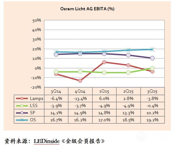 實際上,觀察過去幾年OSRAM的產(chǎn)品收入結(jié)構(gòu)就會發(fā)現(xiàn),在全球LED照明迅速替換掉傳統(tǒng)的光源的時候,OSRAM雖然也有向LED照明轉(zhuǎn)進的意愿,但是OSRAM的LED部門主要定位中高端,能夠提供的支持實在太有限,完全無法應對亞洲廠商的低價化浪潮。即使是同為跨國品牌的Philips在LED替換浪潮中也比OSRAM靈活了許多,不僅利用全球品牌和通路的優(yōu)勢在全球市場上牢牢占據(jù)出???,更是充分利用中國的供應鏈的成本優(yōu)勢,保住全球領(lǐng)導性地位。而OSRAM顯然是這場變革中的被逆襲者,就在過去的數(shù)個季度,LAMPS以及照明系統(tǒng)(LSS)產(chǎn)品EBITA多次出現(xiàn)負值,近3個季度更出現(xiàn)連續(xù)下滑的趨勢。