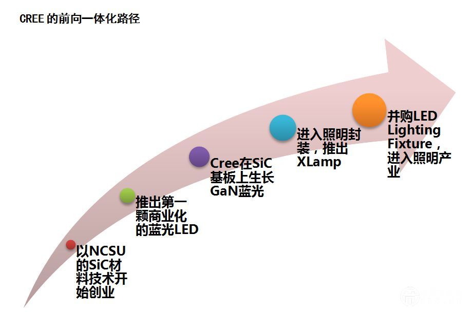 如果要舉出LED行業(yè)最典型前向一體化的企業(yè)代表的話,無疑非CREE莫屬。從SiC的材料優(yōu)勢發(fā)展到垂直芯片的優(yōu)勢再到高光效記錄保持者的器件廠商再到美國市場前列的照明品牌,CREE有一條完全不同于基于藍寶石襯底的LED工業(yè)的發(fā)展路徑。