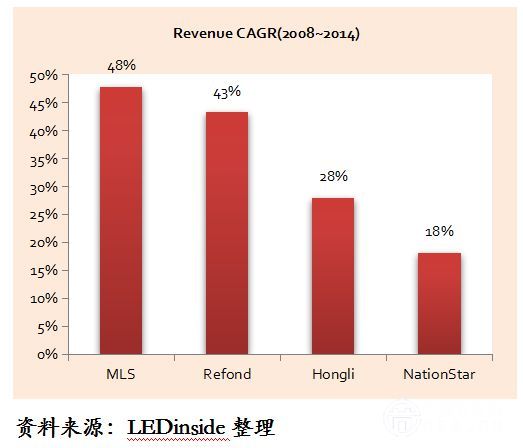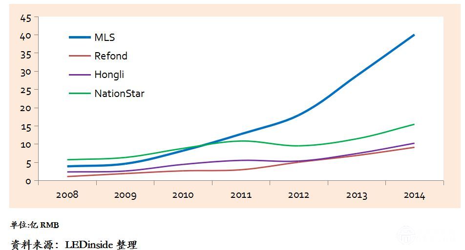 與差不多同時期興起的幾家中國封裝廠如國星,瑞豐,鴻利相比,木林森的成長速度驚人,2008年之前彼此的相差還不甚大,然而到2014年,收入規(guī)模差不多拉開了3~4倍的距離。