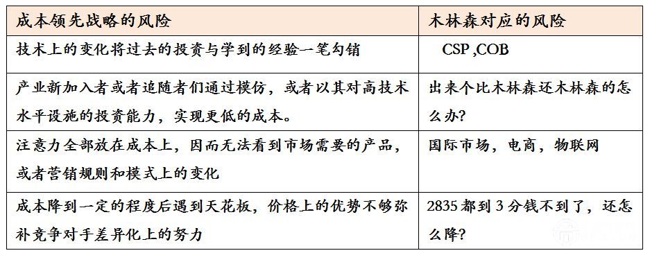 然而采取了成本領(lǐng)先策略也有其風險,特別是在市場和技術(shù)都快速變化的LED行業(yè),舉例來講,如果CSP真如鼓吹者們所言,最終會省掉封裝環(huán)節(jié),那么目前以封裝為主營并以封裝產(chǎn)能規(guī)模和技術(shù)領(lǐng)先為優(yōu)勢的企業(yè)就面臨優(yōu)勢不再,競爭力消失的風險。