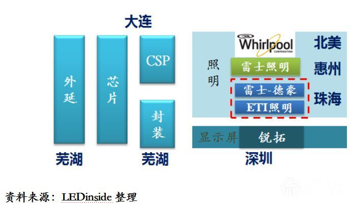 通常討論LED行業(yè)的經(jīng)典商業(yè)模式,飛利浦和OSRAM兩大巨頭都從產(chǎn)業(yè)最上游的LED芯片做到最下游的應用產(chǎn)品,是LED行業(yè)教科書式的縱向一體化代表。中國廠商中,雖然多數(shù)企業(yè)都采取了專業(yè)化分工的模式參與LED產(chǎn)業(yè)鏈,但其中也有德豪潤達奉縱向一體化戰(zhàn)略為圭臬,從2009年并購健隆達進入LED行業(yè)開始,便通過一些列的投資和并購逐漸補齊全產(chǎn)業(yè)鏈,擁有了從芯片到封裝到應用再到照明品牌的完整產(chǎn)業(yè)鏈環(huán)節(jié)。