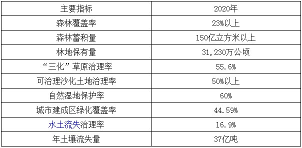 近些年,盡管我國(guó)生態(tài)保護(hù)、修復(fù)工作取得積極進(jìn)展,但我國(guó)生態(tài)環(huán)境整體惡化的趨勢(shì)仍未得到根本遏制。為此,我國(guó)政府提出了2020年生態(tài)環(huán)境保護(hù)和建設(shè)的目標(biāo),為我國(guó)經(jīng)濟(jì)社會(huì)可持續(xù)發(fā)展和國(guó)家生態(tài)安全提供了政策保障,也為生態(tài)修復(fù)領(lǐng)域的發(fā)展趨勢(shì)提供了良好機(jī)遇,具體目標(biāo)如下: