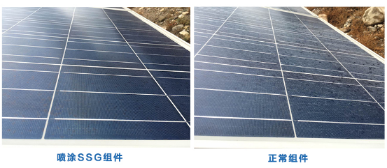 SSG膜層原料是一種功能性水基溶液,在電站現(xiàn)場或者組件廠噴涂之后,常溫即可快速固化,形成無機納米結構膜層,永久牢固的“長”在光伏玻璃基材表面,壽命在25年以上。這種涂層可以提升組件的轉化效率,使得玻璃表面具備超強親水性與防塵能力,同時該膜層還具備分解鳥糞、汽車尾氣等有機物污物的能力。SSG膜層已經(jīng)應用到我國50多個共計150MW的光伏電站項目中,國電龍源、中廣核、中節(jié)能、三峽、中電建等知名企業(yè)都已應用,備受好評。國網(wǎng)英大財險還為SSG膜層增發(fā)電量承保,對比參考方陣(未噴涂SSG材料)發(fā)電量增發(fā)少于3%時進行賠償,賠償額度達2000萬元。