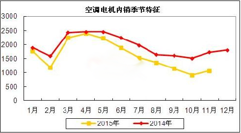 制冷快報訊,根據(jù)產(chǎn)業(yè)在線統(tǒng)計數(shù)據(jù)顯示,2015年11月,空調(diào)電機內(nèi)銷量1065萬臺,同比下滑38.24%,環(huán)比下滑16.9%;財年累計內(nèi)銷量17691萬臺,同比下滑17.79%;冷年累計內(nèi)銷量4474.5萬臺,同比下滑30.99%。