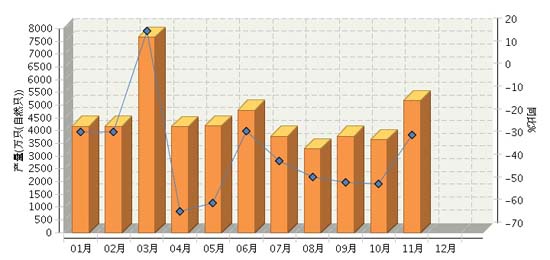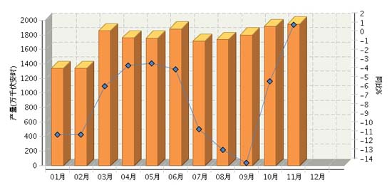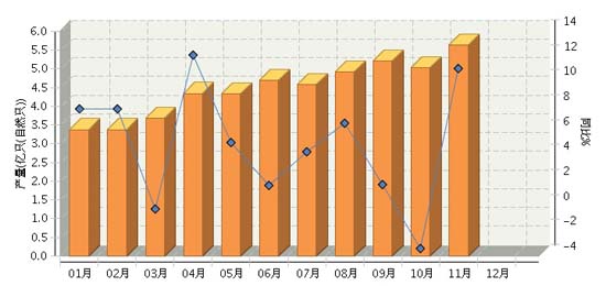 2015年1~11月,全國鋰離子電池行業(yè)累計(jì)完成產(chǎn)量同比增長-0.57%。其中:11月份完成產(chǎn)量同比增長-3.4%。2015年全國鋰離子電池行業(yè)月度產(chǎn)量及同比如上圖所示。
