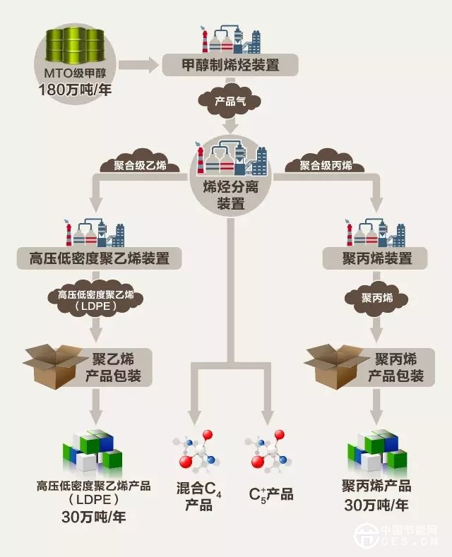 神華陜西甲醇下游加工項(xiàng)目是涉及國家陜北能源戰(zhàn)略規(guī)劃的重大項(xiàng)目,在榆神工業(yè)區(qū)清水工業(yè)園區(qū)203.18公頃土地上,以甲醇為原料,通過甲醇制烯烴、烯烴聚合工藝路線生產(chǎn)聚烯烴產(chǎn)品。他們的主要生產(chǎn)裝置包括:60萬噸/年甲醇制烯烴裝置(MTO)、60萬噸/年烯烴分離裝置、30萬噸/年低密度聚乙烯裝置(LDPE)、30萬噸/年聚丙烯裝置(PP)。他們的煤化工產(chǎn)品是這樣生產(chǎn)出來的:
