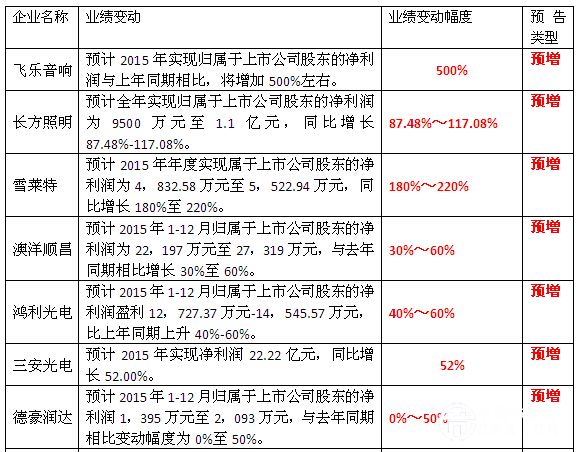 2015年已塵埃落定,最近,LED上市公司陸續(xù)公布了2015年業(yè)績預(yù)告,據(jù)不完全統(tǒng)計(jì),目前已有至少26家LED照明企業(yè)披露了2015年成績單,其中,飛樂音響、雪萊特、茂碩電源、天茂集團(tuán)、長方照明等企業(yè)業(yè)績與去年同期相比,出現(xiàn)大幅度增長,飛樂音響的漲幅達(dá)500%,呈現(xiàn)多倍增長態(tài)勢。與此同時(shí),亦有華燦光電、海洋王、木林森等企業(yè)業(yè)績下滑,具體如下表所示。