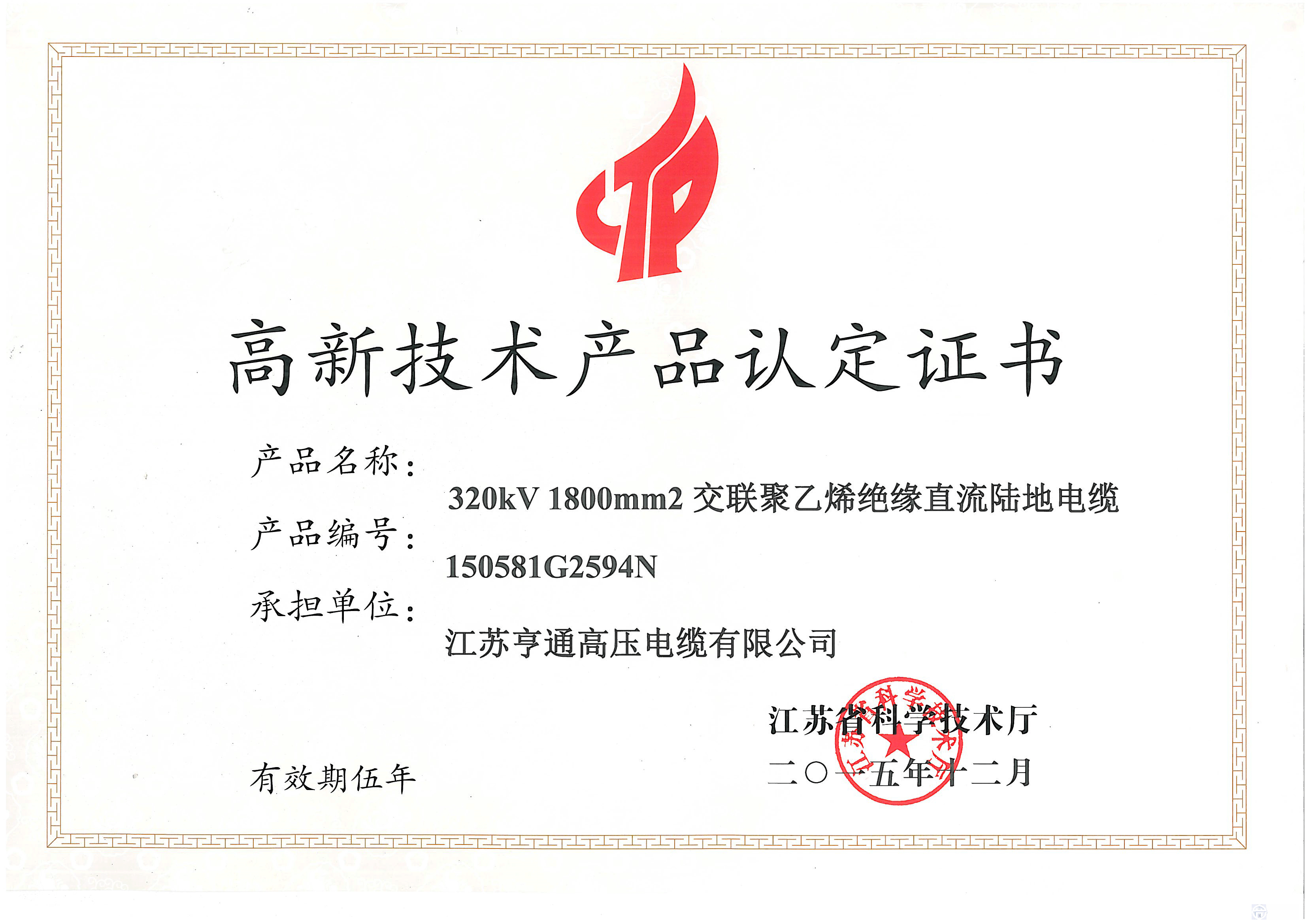 日前,江蘇亨通高壓電纜有限公司(以下簡稱:亨通高壓)“110kV交聯(lián)聚乙烯絕緣銅絲屏蔽鉛套高阻水、耐腐蝕電力電纜”、“320kV1600mm²交聯(lián)聚乙烯絕緣直流陸地電纜”2項(xiàng)產(chǎn)品被江蘇省科學(xué)技術(shù)廳認(rèn)定為高新技術(shù)產(chǎn)品。