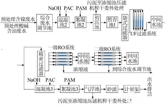 該企業(yè)廢水經(jīng)過處理后,要求廢水排放指標(biāo)穩(wěn)定達(dá)到國家《污水綜合排放標(biāo)準(zhǔn)》(GB8978—1996)二級排放標(biāo)準(zhǔn),即pH為6~9,COD≤100mg/L,SS≤70mg/L,石油類≤5mg/L,色度≤50mg/L,總鎳達(dá)到《電鍍污染物排放標(biāo)準(zhǔn)》(GB21900—2008)表2標(biāo)準(zhǔn),即總鎳≤0.5mg/L,實(shí)現(xiàn)約70%的出水回用,余下30%的出水接入市政污水管網(wǎng)到集中污水處理廠進(jìn)行深度處理。