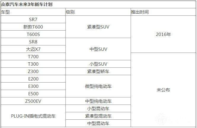 按照眾泰汽車規(guī)劃,未來三年將推出至少15款車型,包括緊湊型SUV 2016款T600、緊湊型SUV T600S、中型SUV T700、小型SUV T300、緊湊型SUV SR7、緊湊型轎車Z300、中型SUV SR8、中型SUV 大邁X7。新能源方面,眾泰將推出三款微型純電動車,分別為E200、E300、E500;一款中型純電動車Z500EV以及A0級、A級、B級三款PLUG-IN插電式混合動力乘用車。