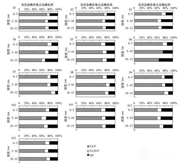 無(wú)機(jī)磷(IP)是湖泊生態(tài)系統(tǒng)中非常重要的磷形態(tài).沉積物中IP平均含量達(dá)到1625.30 mg ˙ kg-1;表層沉積物中IP平均含量最大值和最小值分別出現(xiàn)在S13號(hào)和S5號(hào)采樣點(diǎn)處,分別為3484.57 mg ˙ kg-1和545.37 mg ˙ kg-1,含量降幅最大的出現(xiàn)在S2號(hào)采樣點(diǎn)處,表層TP含量是沉積物底層(10~15 cm)的3.57倍,降幅達(dá)到71.96%.從圖 3d、3e和圖 4中可以得出,沉積物TP、IP含量垂向變化趨勢(shì)基本與CaP一致,而且CaP又在TP、IP中比例均達(dá)到最大,說(shuō)明沉積物中TP含量主要受其中IP含量影響,而IP含量主要受其中CaP含量影響.沉積物中TP含量所表現(xiàn)出的“表層富集”一種普遍存在的現(xiàn)象,一些人認(rèn)為這主要是外源污染嚴(yán)重而導(dǎo)致沉積物表層磷含量的增加: 還有一些人認(rèn)為這可能是由于沉積物中磷的地球生物化學(xué)作用而導(dǎo)致其向表層遷移所致越大.TP含量在垂直距離上表現(xiàn)出逐漸降低的原因可能是河流流速緩慢,低棲動(dòng)物較少,河流中水生植物較少,根系對(duì)沉積物中TP含量影響較小;此外,受到生活污水排放量的增加和農(nóng)業(yè)面源污染加大的影響,大量的外源營(yíng)養(yǎng)物質(zhì)不能夠及時(shí)擴(kuò)散被懸浮物質(zhì)吸附就直接沉淀下來(lái).