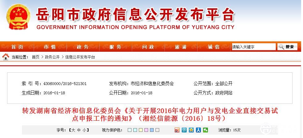 湖南《關(guān)于開展2016年電力用戶與發(fā)電企業(yè)直接交易試點申報工作的通知》