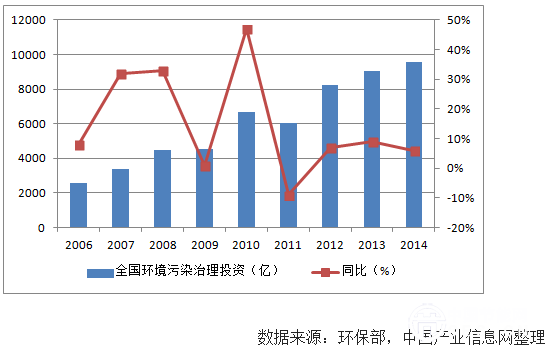 2006-2014年全國環(huán)境污染治理投資額及增速