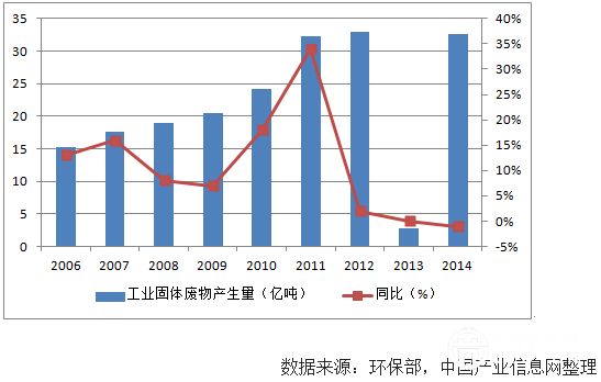 2006-2014年中國工業(yè)固體廢物產(chǎn)生量及同比增速