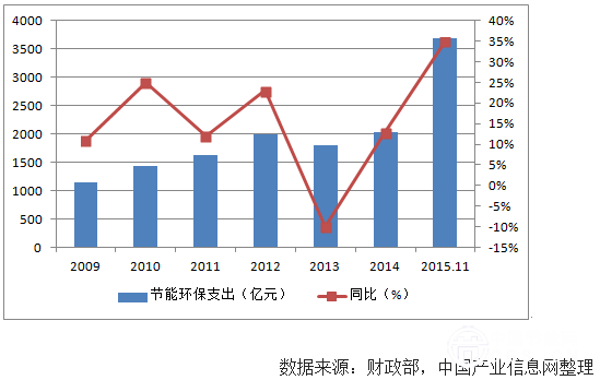 2014年全國環(huán)境污染治理投資為9576億元,同比增長6%,“十二五”期間全國環(huán)境污染治理投資有望達(dá)到5萬億元。據(jù)環(huán)保部規(guī)劃院測算,“十三五”全社會(huì)環(huán)保投資將達(dá)到17萬億元,是“十二五”的3倍以上;環(huán)保產(chǎn)業(yè)將成為拉動(dòng)經(jīng)濟(jì)增長重要支柱。其中,部分資金來自于中央財(cái)政。自2007年以來中央財(cái)政節(jié)能環(huán)保支出呈增長趨勢,2015年1-11月中央財(cái)政節(jié)能環(huán)保支出達(dá)到3,692億元,同比增加35%。