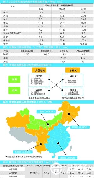 意見稿中明文指出,“十三五”太陽能光伏裝機(jī)目標(biāo)為150GW,其中包含70GW的分布式光伏電站以及80GW的集中式光伏電站。若需達(dá)成此目標(biāo),則中國(guó)未來五年內(nèi)平均每年的光伏設(shè)備需求量將突破20GW。若上述目標(biāo)達(dá)成,那么到2020年底,太陽能發(fā)電裝機(jī)規(guī)模將在全國(guó)電力結(jié)構(gòu)中占比7%,在新增電力裝機(jī)結(jié)構(gòu)中占比15%,在全國(guó)發(fā)電量結(jié)構(gòu)中占比2.5%。而在整體太陽能裝機(jī)量中,光伏發(fā)電占94%、太陽光熱占6%;西部地區(qū)占太陽能發(fā)電裝機(jī)量35%,其他65%則分布在中、東部地區(qū)。