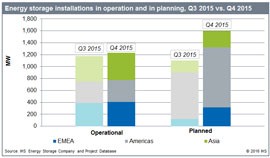 HIS主要分析師Marianne Boust評論道:“由于電池成本降低、政府扶持項目和公用事業(yè)招標,引發(fā)全球儲能市場取得快速增長。2015年第四季度全球儲市場增長近400 MW。”