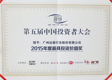 達森燈光獲頒“2015年度最具投資價值獎”