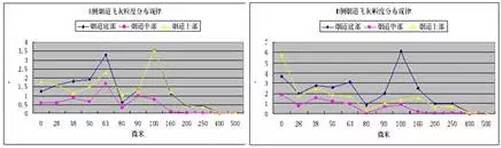 催化劑局部磨損的主要原因有流速分布不均,飛灰分布不均勻,飛灰顆粒度分布不均,此次試驗分別對SCR煙氣系統(tǒng)A/B側(cè)煙道的流速分布(見圖3-3)、飛灰重量分布(見圖3-4)、飛灰顆粒度分布(見圖3-5)進行了測量。