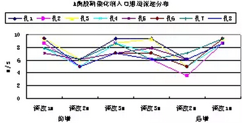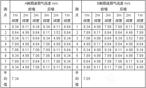 A、B側(cè)煙道煙氣流速基本均勻,A側(cè)煙道平均流速7.34m/s,B側(cè)煙道平均流速7.05m/s。沿?zé)煹缹挾确较颍珹、B側(cè)煙道風(fēng)速流場較為均勻,基本都在7m/s左右波動。沿?zé)煹郎疃确较?,煙道前后煙氣流速呈對稱分布,在距離煙道壁面2m左右深度流速較低約為5m/s,其他深度流速在6~10m/s;