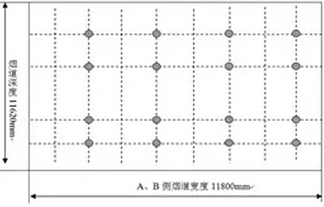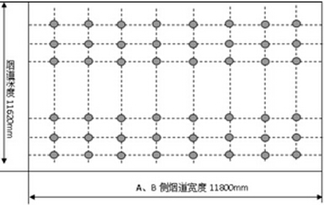 鍋爐運行參數(shù)穩(wěn)定后,使用煙塵采樣儀和煙塵采樣槍,按網(wǎng)格法分別在AB側(cè)煙道內(nèi)各試驗測點等速采取飛灰樣品,每點采樣15分鐘,試驗結(jié)束后稱量樣品重量,計算煙道內(nèi)各測點飛灰濃度,獲得該位置煙道內(nèi)飛灰濃度分布規(guī)律。煙道尺寸11880mm(寬)×11620mm(深),取樣槍長度3500mm,分別從煙道前部和后部兩個方向測量,能夠覆蓋煙道內(nèi)前部3500mm和后部3500mm深度范圍。