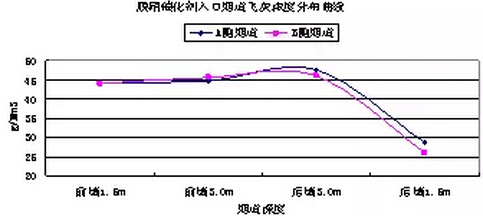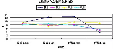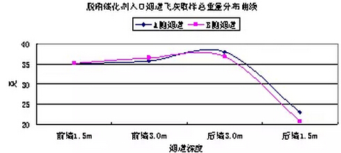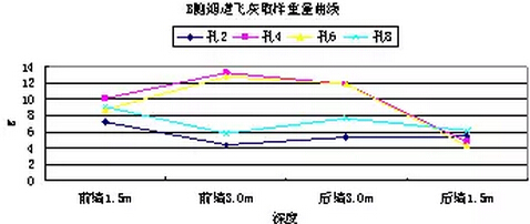 根據(jù)以上數(shù)據(jù)分析,沿?zé)煹缹挾确较颍w灰濃度分布相對均勻,沒有明顯的規(guī)律性差異。沿?zé)煹郎疃确较?,飛灰濃度差別相對較大,距離前墻1.5m和3m深度位置與距離后墻3m深度位置飛灰濃度比較一致,均為45g/Nm3左右,距離后墻1.5m深度位置,飛灰濃度大幅降低至30 g/Nm3以下;