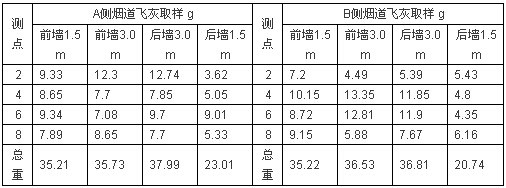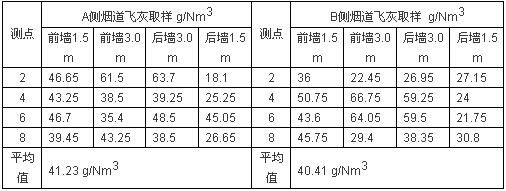 在每個測點等速取樣15min,分別測量飛灰取樣總量,根據(jù)飛灰取樣數(shù)據(jù)計算出每立方米煙塵濃度。試驗數(shù)據(jù)如下: