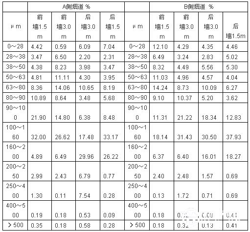 對所取飛灰樣品進行粒度分析,A、B側(cè)煙道深度為前墻1.5m、前墻3m、后墻1.5m和后墻3m處樣品分別混合后篩分,獲得樣品粒度在0~500μm之間的分布規(guī)律,分析結(jié)果如下。