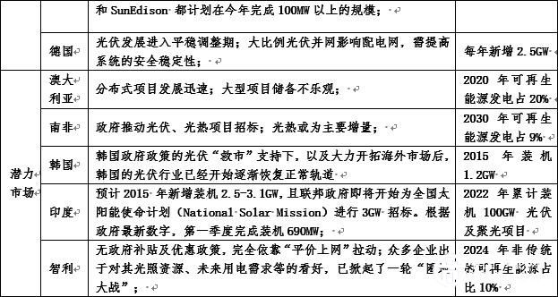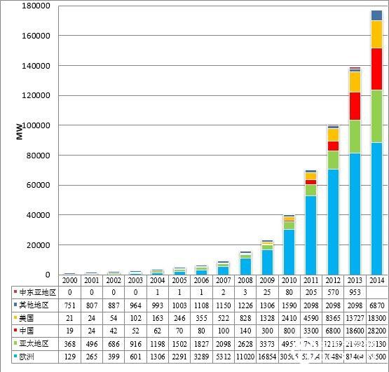 光伏累計(jì)裝機(jī)方面,德國(guó)依靠先前的巨大優(yōu)勢(shì)以38.2GW的規(guī)模仍占據(jù)第一。中國(guó)和日本憑借近兩年最強(qiáng)勁的發(fā)展勢(shì)頭超越意大利排名二三位。美國(guó)則甩開(kāi)了與西班牙的差距,以18.3GW的規(guī)模排名第五。此外,英國(guó)、澳大利亞、印度等國(guó)累計(jì)裝機(jī)都超過(guò)了3GW,而全球已共有20個(gè)國(guó)家裝機(jī)超過(guò)1GW。截止2014年底,全球光伏總裝機(jī)177GW。增長(zhǎng)動(dòng)力主要來(lái)自中國(guó)、日本、美國(guó)等體量較大市場(chǎng),以及英國(guó)、印度、智利等新興市場(chǎng)。
