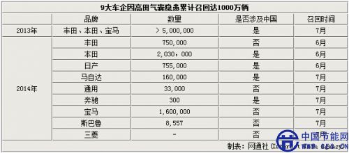 日本高田公司是一家生產(chǎn)汽車安全氣囊、安全帶、方向盤等汽車安全裝置的著名制造商。直至發(fā)稿截止全球已有9家知名車企因高田氣囊隱患而受到影響,分別為本田、豐田、日產(chǎn)、馬自達、斯巴魯、三菱、通用、寶馬和奔馳,上述車企涉及車輛已共計達1000萬輛。