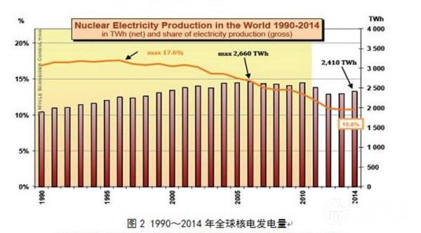 2015年前7個月,全球共有31個國家運(yùn)行核反應(yīng)堆,核反應(yīng)堆共有391座,總裝機(jī)容量達(dá)到337GW。2014年核電發(fā)電量為2410TWh,與2013年相比增長2.2%,但仍比2006年最高點(diǎn)低9.4%。