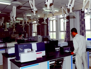 延長石油碳?xì)溲芯恐行脑囼?yàn)示范基地?fù)碛心壳叭蜃钕冗M(jìn)的石油碳?xì)湓囼?yàn)裝置之一。圖為科研人員正在實(shí)驗(yàn)室內(nèi)操作。
