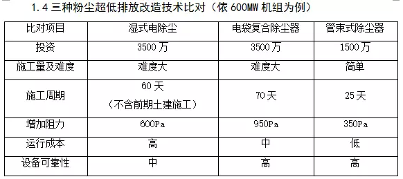 綜合以上比較,管束式除塵器無論從投資、施工及運行成本、可靠性來說,在燃煤機組粉塵超低排放改造中,都具有一定優(yōu)勢,可作為改造技術(shù)路線的首要選擇。