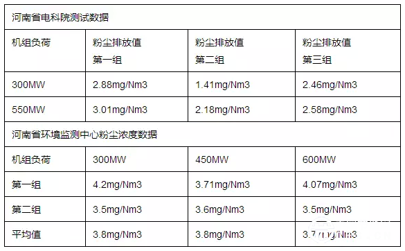 孟津電廠分別委托河南省電科院及河南省環(huán)境監(jiān)測中心,對管除出口粉塵濃度在不同工況下進行了測試,測試數(shù)據(jù)如下: