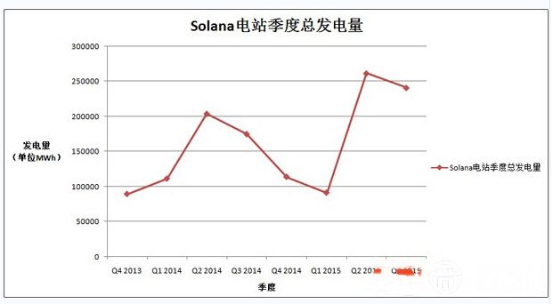 因2015年12月份的數(shù)據(jù)尚未更新,我們暫且大概推算一下兩大電站在2015年度的全年發(fā)電量。Solana電站2015年10月和11月的發(fā)電量分別為49469MWh和46262MWh。粗略估算,Solana電站2015年度總發(fā)電量約為738405MWh。相對2014年全年的603567MWh,發(fā)電量增長約22.3%。2015年的年發(fā)電量達(dá)到其預(yù)期發(fā)電能力的78.22%。