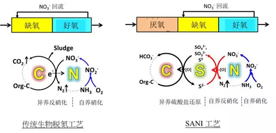 SANI工藝將硫酸鹽還原為基礎(chǔ)的高效厭氧(水溫20度時(shí)水力停留時(shí)間可降至4小時(shí)以內(nèi))引入城市污水處理,同時(shí)利用所產(chǎn)大量溶解性硫化物(大量硫酸鹽還原自動(dòng)提高反應(yīng)器pH至堿性水平使得所產(chǎn)硫化氫幾乎完全溶解于水)作為取代有機(jī)物的電子供體體實(shí)現(xiàn)后續(xù)自養(yǎng)反硝化(有機(jī)物非依賴性除氮過程)。