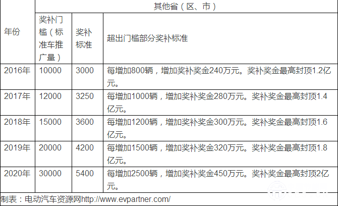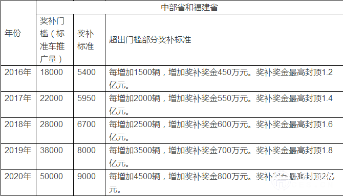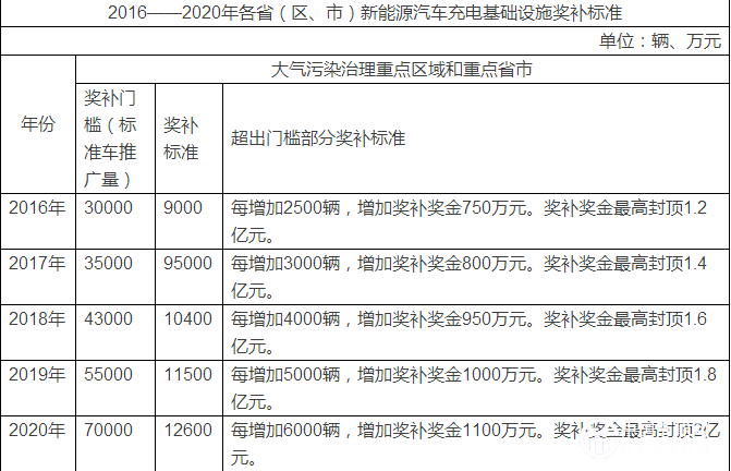 根據(jù)財(cái)政部、工業(yè)和信息化部等部委聯(lián)合發(fā)布的《關(guān)于“十三五”新能源汽車充電基礎(chǔ)設(shè)施獎(jiǎng)勵(lì)政策及加強(qiáng)新能源汽車推廣應(yīng)用的通知》,各省區(qū)市要獲得新能源汽車充電基礎(chǔ)設(shè)施建設(shè)、運(yùn)營獎(jiǎng)補(bǔ)資金,需達(dá)到一定的推廣規(guī)模。