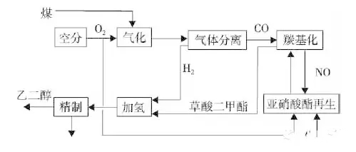 原料煤通過煤氣化爐,制得合成氣,送入合成氣分離工段,一氧化碳原料氣的再凈化處理,從合成氣凈化裝置出來的一氧化碳原料氣,采用催化氧化技術(shù)除去氫和氧最后以分子篩脫水。該混合氣體即可作為合成草酸酯的一氧化碳原料氣。