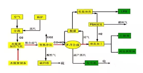 原料煤經(jīng)過粉碎預(yù)處理后,進(jìn)入煤氣化爐內(nèi)與氧氣進(jìn)行不完全氧化反應(yīng),得到半水煤氣水煤氣。通過變換凈化處理后送入費(fèi)托合成工段,合成油經(jīng)過裂解重整加工后制得成品柴油與石腦油。費(fèi)托合成是本工藝的核心,目前國內(nèi)采用中科合成技術(shù),采用漿化床反應(yīng)器,鐵基催化劑。