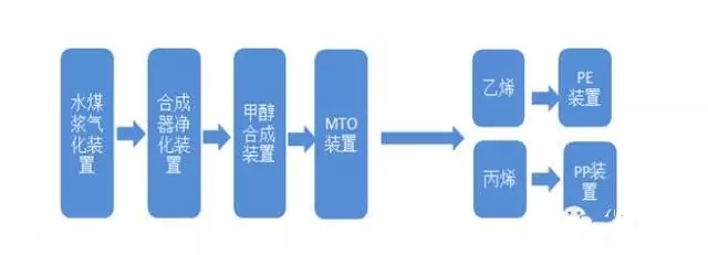 原料煤經(jīng)過粉碎預(yù)處理后,進(jìn)入煤氣化爐內(nèi)與氧氣進(jìn)行不完全氧化反應(yīng),得到半水煤氣水煤氣,通過氧化鋅脫硫劑進(jìn)行濕法脫硫后,通過一氧化碳與水反應(yīng)調(diào)整碳?xì)浔壤?,使變換氣碳?xì)浔壤秊?.05~2.15送入甲醇合成回路。置換氣經(jīng)過成氣壓縮機(jī)加壓至5. 3~5. 5MPa后進(jìn)入合成塔,在溫度220~260℃及銅基催化劑的作用下反應(yīng),產(chǎn)物經(jīng)過雙塔精餾,得到甲醇。甲醇通過MTO、MTP工藝制取乙烯或丙烯。進(jìn)一步送聚酯工段,得到聚乙烯等高分子材料。